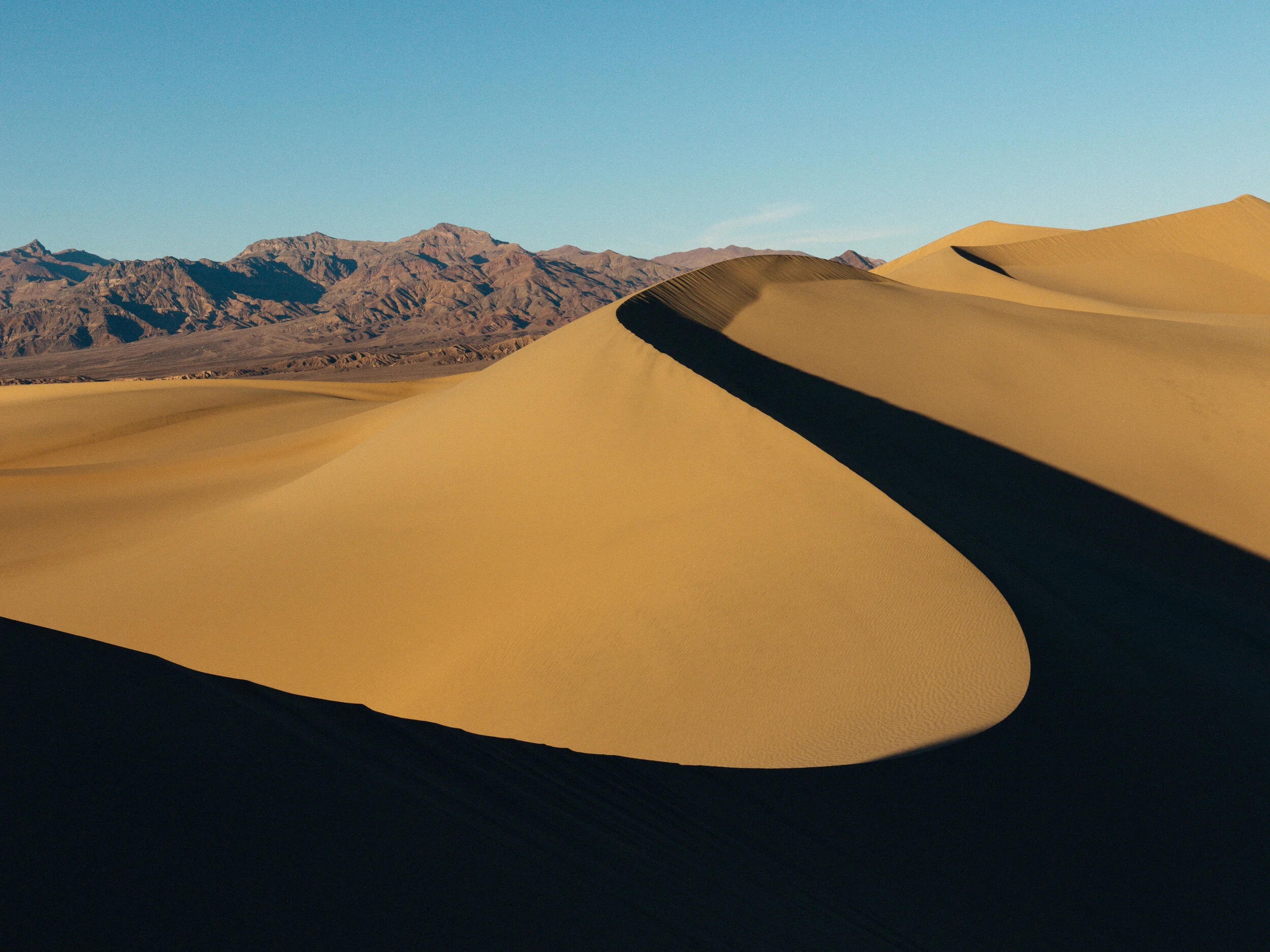 The Mesquite Flat Sand Dunes in Death Valley. Fine Art Archival Photography Giclee Print on your choice of either Hahnemühle Photo Gloss Baryta 320gsm Paper (Gloss) or Hahnemühle Torchon 285gsm Paper (Matt). Available in 4x sizes with 1/2 inch border ready to mount and frame. Please allow 7x working days for delivery.
